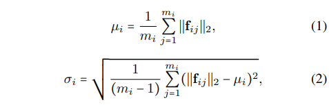 避免由于特征维度高但样本量小带来的维度灾难,使用 \(\mathbf{x} _{i} = [µ_{i} , σ_{i}]\) (视频片段特征幅度的均值和标准差) 来表示每个视频 \(V_{i}\),计算公式如下: