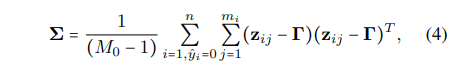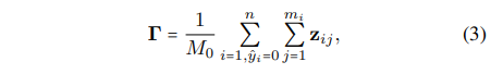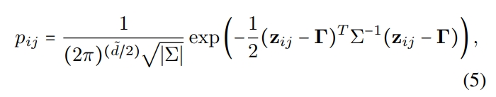 先仅使用正常视频片段。 \(\mathbf{z} _{ij}=\left \| \mathbf{f}_{ij} \right \| _{2}\) 为片段的低维表示,遵循高斯分布\(\mathcal{N} (\mathbf{\Gamma } ,\mathbf{\Sigma } )\),Γ, Σ 即所有正常片段 \(\mathbf{z} _{ij}\) 的均值和方差,拿到 Γ, Σ 两个值。计算公式如下:
