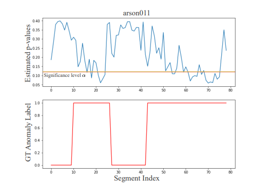 使用假设检验检测异常片段。零假设:给定的视频片段是正常的。特征分布建模为高斯分布,估计其 P 值,如果小于显著水平 α,则拒绝零假设,该片段是异常的。