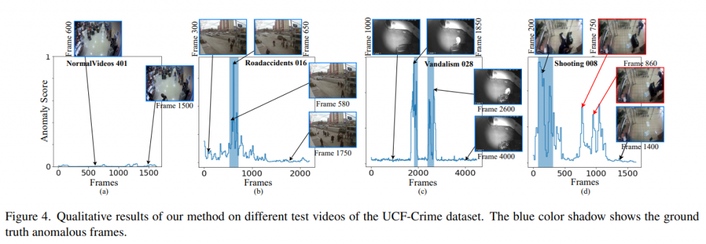 D图可视化了一个失败案例,即shooting008视频(UCF-Crime)。检测器在实际枪击事件发生后的几帧预测为了异常。仔细检查这段视频发现,一个持枪的人在枪击事件后进入了现场,检测器将其标记为异常,但实际的帧标签是正常,这种差异会影响到帧级的AUC。