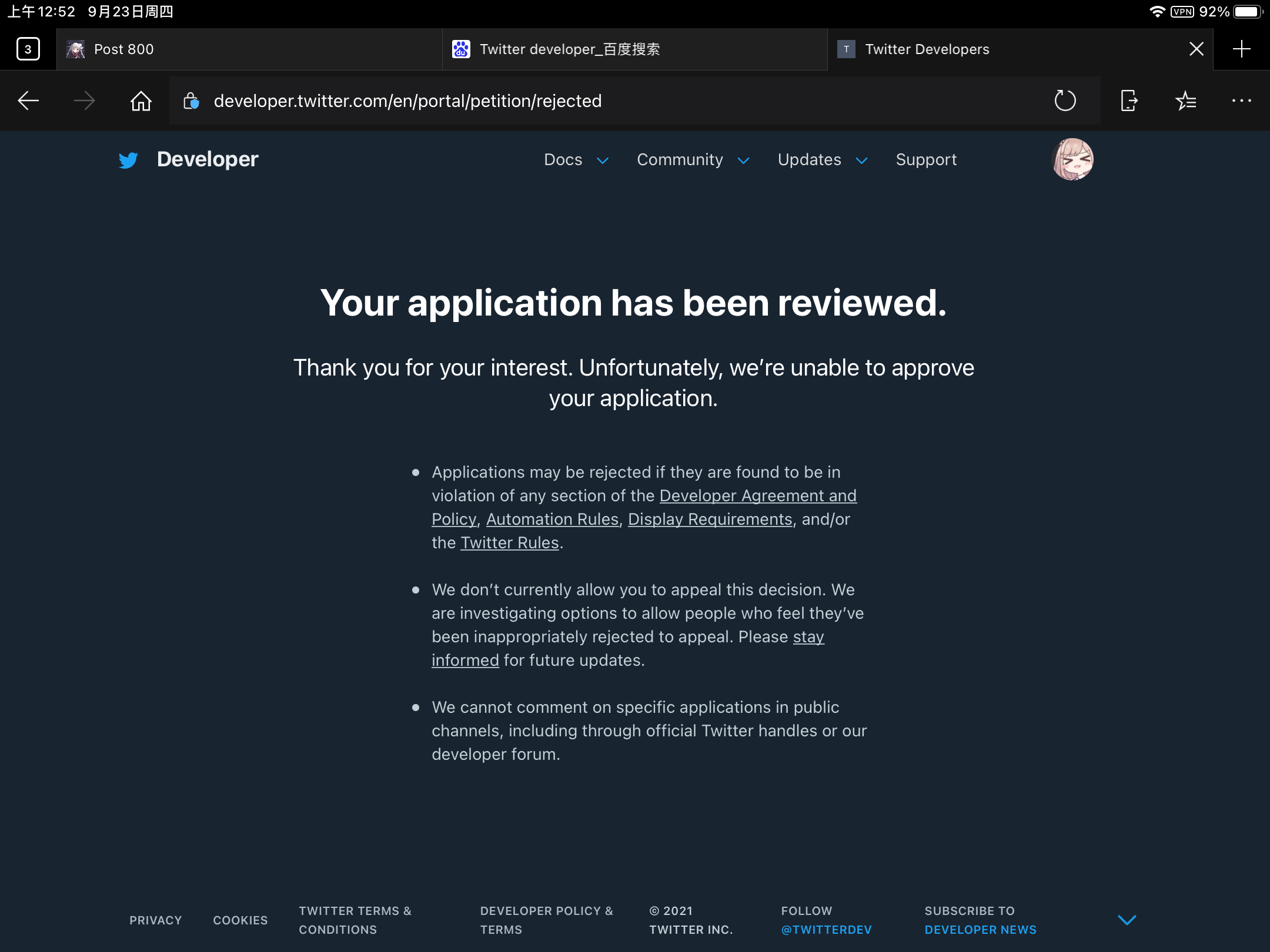 由于一个推特号只能申请一次开发者账号,申请失败就意味着这个帐号没机会了。没办法,只能重新换个推特号弄。
