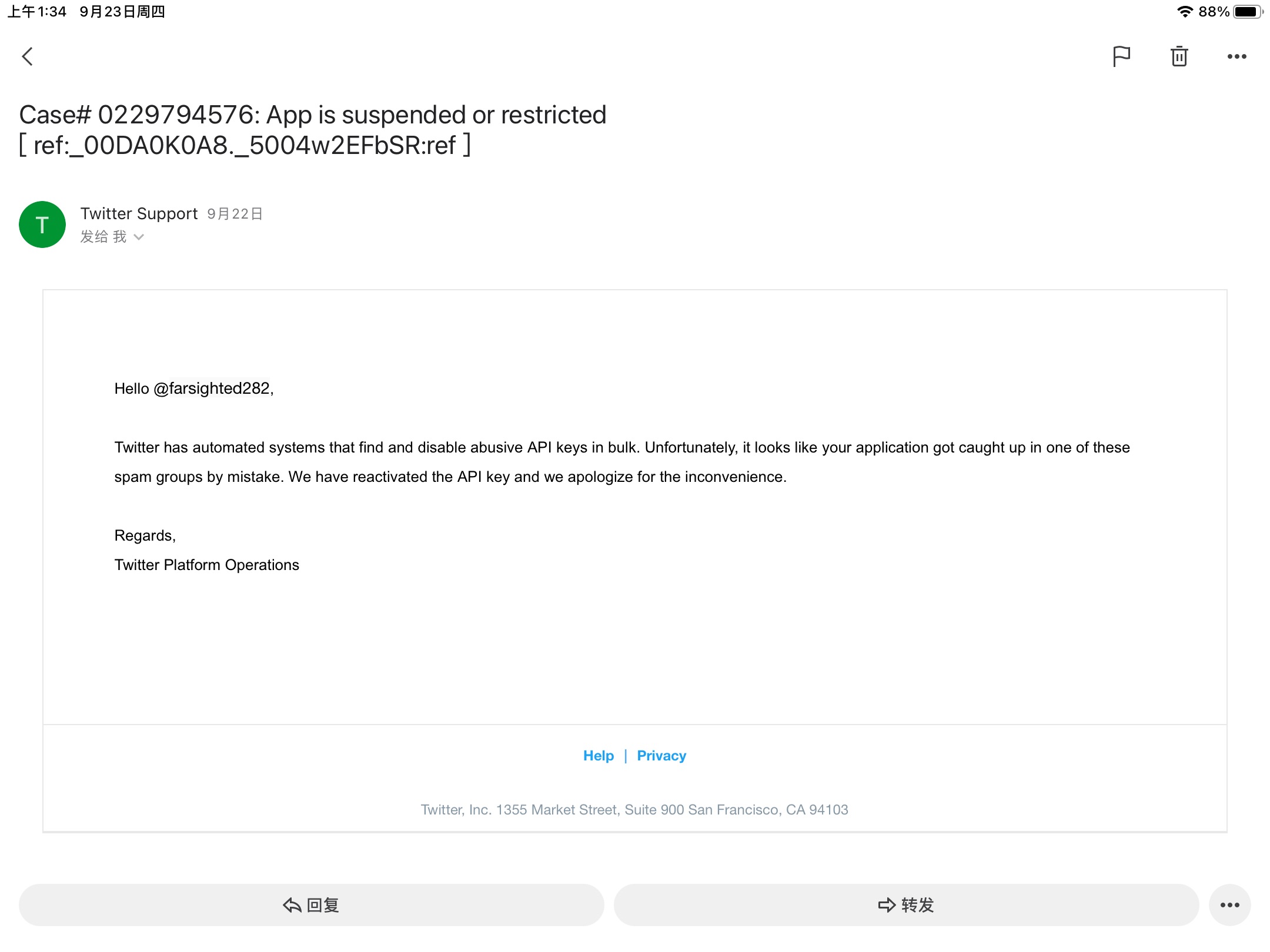 等了半个月,邮箱里终于收到推特的邮件,怎么推特的审核效率这么慢呢。